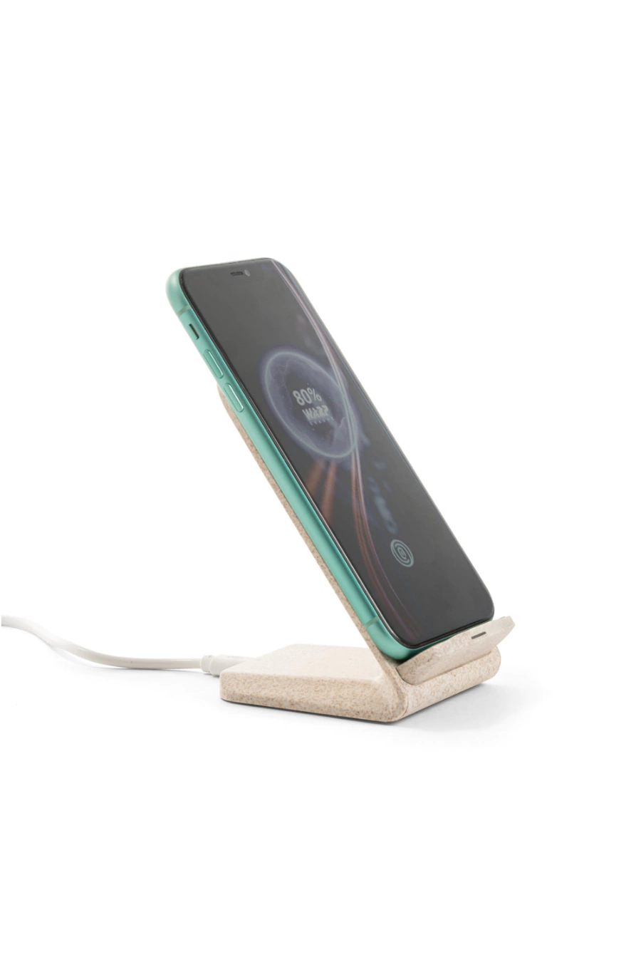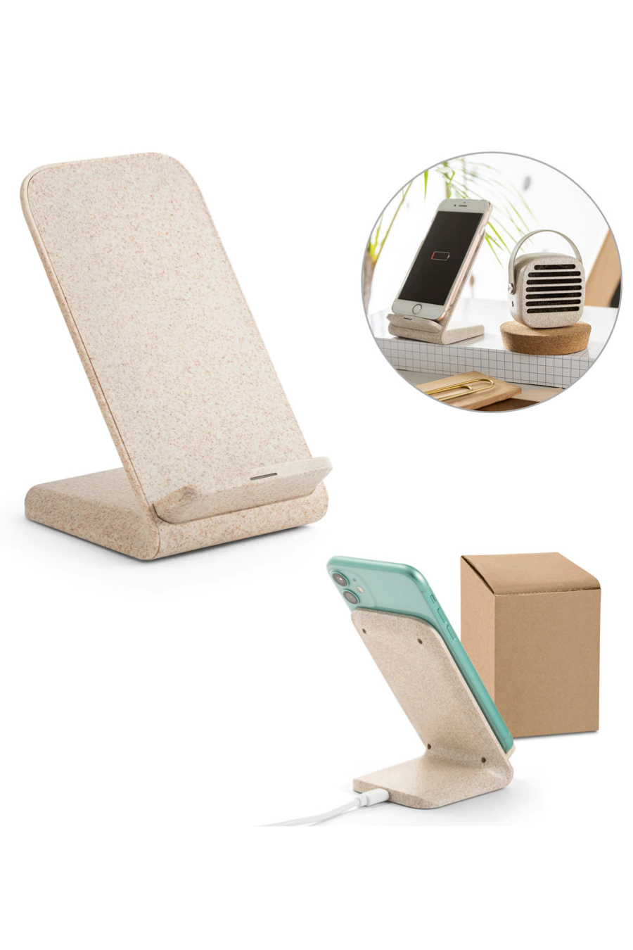Suporte para celular com carregador wireless super rápido em fibra de palha de trigo e ABS. Com uma potência máxima de 15W, porta de entrada USB-C e incluso cabo USB-C de 1 m. Fornecido em caixa presente de papel kraft.