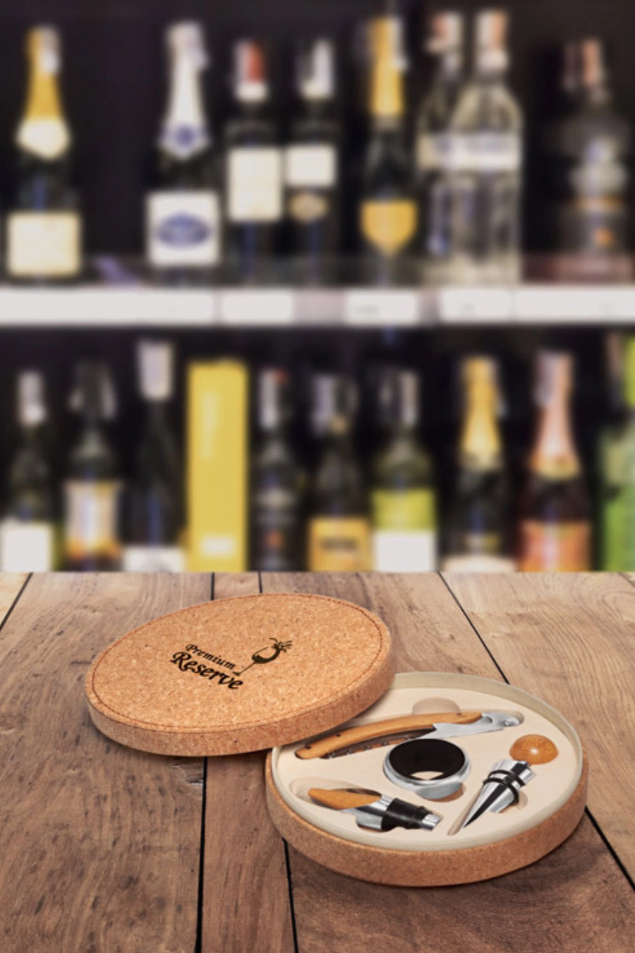 Conjunto para vinho com 4 peças em madeira e metal: saca-rolhas com canivete de sommelier, gargantilha, salva-gotas com tampa e rolha. Fornecido em caixa presente em cortiça. A cor e o resultado da impressão nos materiais naturais pode variar entre produtos.