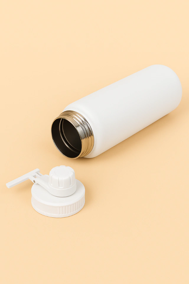 Garrafa térmica com parede dupla em aço inox. Tampa roqueável com anel de silicone para vedar a garrafa, alça em formato de mosquetão e bico rosqueável.