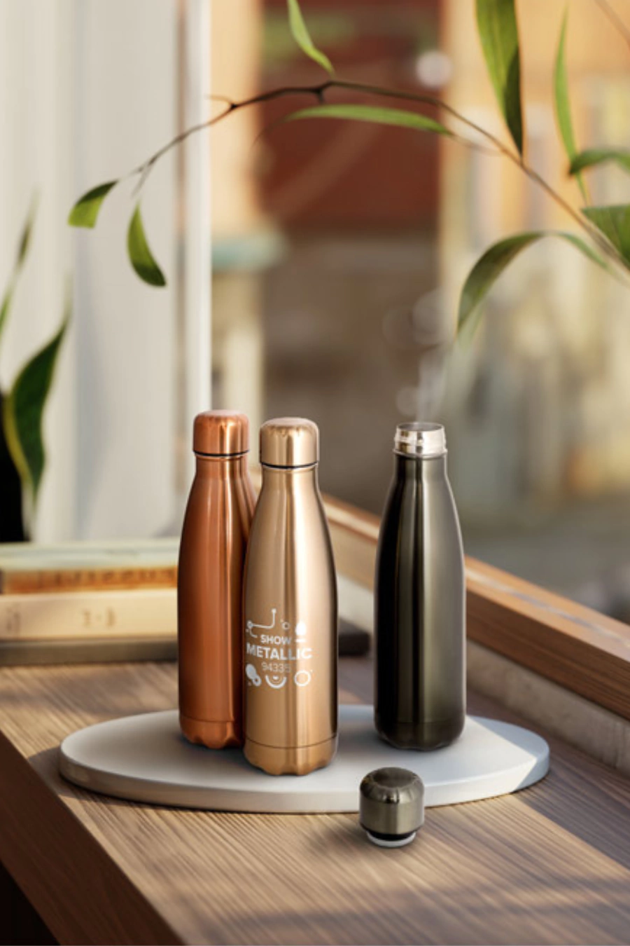 Garrafa em aço inox de parede dupla térmica, isolada a vácuo. Garrafa com acabamento metalizado e tampa em aço inox. Todas as componentes da garrafa - tampa, corpo e base - na mesma cor. Capacidade até 510 mL. Fornecido em caixa presente de papel kraft. Certificação EU Food Grade.