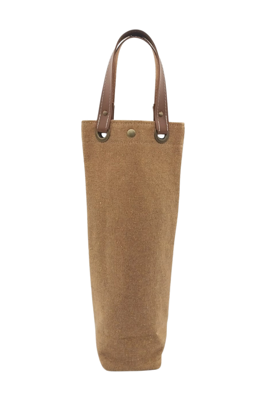 Porta Garrafa feito em tecido de sarja, com detalhes em couro ecológico, ilhós, rebite e botão de imã em ouro velho. Combinação perfeita de praticidade e elegância.