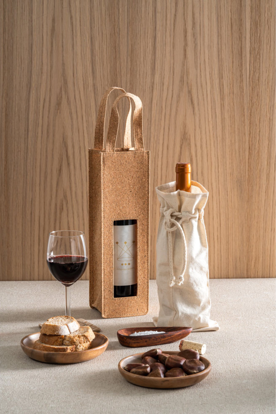 Sacola em cortiça para 1 garrafa. Sacola amiga do ambiente com 2 alças e janela na parte frontal, ideal para oferta. A cor e o resultado da impressão nos materiais naturais pode variar entre produtos.